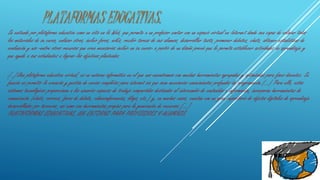 El documento describe las diferentes herramientas y plataformas educativas digitales para la capacitación a distancia. Menciona plataformas como WebCT y FirstClass, así como plataformas de software libre. También describe ejemplos de herramientas como webinarios, videoconferencias y ejemplos de plataformas populares como Google Docs, YouTube, Skype y Facebook.