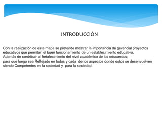 Este documento describe la importancia de la gerencia de proyectos educativos para mejorar el funcionamiento y el nivel académico de los estudiantes en las instituciones educativas. Explica que los principales roles de un gerente de proyectos incluyen la planificación, organización y administración, así como la verificación y medición durante las diferentes fases de un proyecto. Finalmente, señala que los directivos, docentes, padres, administrativos y estudiantes son los principales responsables de establecer adecuadamente el ciclo de vida de