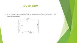 El documento presenta información sobre conceptos básicos de circuitos eléctricos como la ley de Ohm, circuitos en serie y paralelo, y las leyes de Kirchhoff. Define que la ley de Ohm establece que la corriente es inversamente proporcional a la resistencia. Explica que un circuito en serie tiene una sola ruta para la corriente, mientras que en un circuito paralelo la corriente se divide. Finalmente, resume que las leyes de Kirchhoff describen el comportamiento de corrientes y voltajes en nodos y bu