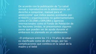 El documento describe un embarazo no deseado como uno que ocurre sin planificación o uso de anticonceptivos efectivos. Explica que los embarazos en adolescentes entre 15-19 años conllevan altos riesgos para la salud de la madre y el bebé. También identifica algunas causas potenciales para los embarazos en adolescentes mexicanas como la búsqueda de aceptación, reafirmación de la identidad o llenar vacíos afectivos.