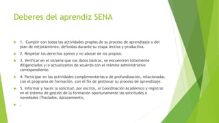 El documento detalla los derechos y deberes de los aprendices del SENA. Entre los derechos se encuentran: 1) recibir una formación profesional integral de acuerdo al mercado laboral, 2) aprovechar programas de bienestar que apoyen su desarrollo, y 3) recibir un trato respetuoso de todos los miembros del centro. Entre los deberes están: 1) cumplir con todas las actividades de su proceso de aprendizaje, 2) respetar los derechos ajenos, y 3) participar en