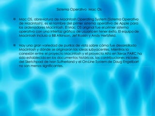 El documento presenta breves descripciones de varios programas de software de Apple como Mac OS, PowerPoint, iMovie, GarageBand, Dreamweaver, iPhoto y Fireworks. Explica que Mac OS fue el primer sistema operativo exitoso con interfaz gráfica, y que PowerPoint se usa ampliamente para presentaciones. Además, describe que iMovie permite editar videos caseros, GarageBand crear música y podcasts, Dreamweaver desarrollar páginas web, iPhoto crear diapositivas y álbumes de fotos, y Fireworks hacer animaciones. Finalmente, p