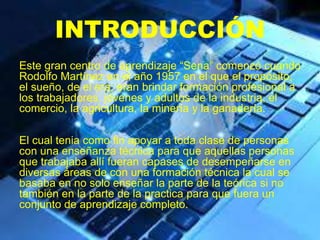 Este documento proporciona información sobre el Servicio Nacional de Aprendizaje (SENA) de Colombia. Explica que el SENA comenzó en 1957 para brindar formación profesional a trabajadores. Describe la misión, visión, principios y valores del SENA, así como su escudo, bandera y logotipo. También explica los roles de aprendiz, aspirante y usuario en el SENA.