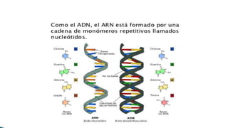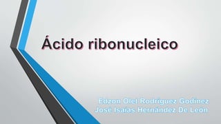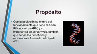 El documento describe la historia, estructura y funciones del ARN. Se descubrió en 1868 y se sabe que juega un papel clave en la síntesis de proteínas desde 1939. Tiene una estructura similar al ADN pero con ribosa en lugar de desoxirribosa y uracilo en lugar de timina. Existen varios tipos de ARN como el mensajero, de transferencia y ribosómico que cumplen funciones distintas como el transporte de información genética y aminoácidos durante la síntesis de proteínas.