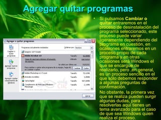 Este documento proporciona una guía sobre las diferentes opciones y herramientas disponibles en el Panel de Control de Windows, incluyendo cómo agregar y quitar programas, configurar la fecha y hora, las opciones del mouse, las conexiones de red, la seguridad y el firewall, y cómo agregar hardware. También explica conceptos básicos como los dispositivos de sonido, la barra de tareas, las cuentas de usuario y los dispositivos de juego. El documento ofrece instrucciones paso a paso para acceder y modificar la configuración de estas diferentes áreas del