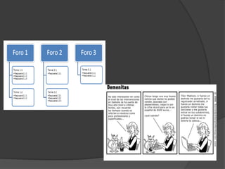 Este documento describe los virus informáticos, foros y tipos de virus. Explica que un foro es un lugar para conversaciones en torno a un tema, y que los virus son programas maliciosos que alteran el funcionamiento de una computadora sin permiso. Detalla varios tipos de virus como troyanos, gusanos, bombas lógicas y hoaxes. Finalmente, resume algunas acciones comunes de los virus como unirse a programas para propagarse, mostrar mensajes molestos, ralentizar computadoras y destruir información.