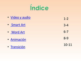 Este documento proporciona definiciones y explicaciones sobre diferentes elementos y herramientas de PowerPoint como video, audio, Smart Art, Word Art, animación, transición. Explica que el video es la tecnología de grabación y reproducción de imágenes en movimiento, el audio es la señal eléctrica de un sonido, Smart Art permite crear gráficos, Word Art permite estilizar texto, la animación enfoca la atención y controla el flujo de información, y las transiciones dan un aspecto profesional a las diapositivas.