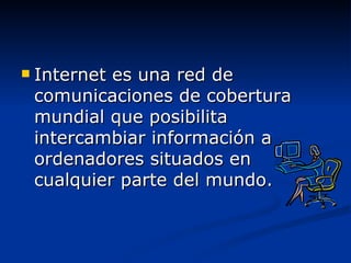 Internet es una red mundial que permite el intercambio de información entre ordenadores de todo el mundo. La World Wide Web (WWW) ha contribuido en gran medida a su popularidad actual al permitir que las personas usen navegadores para acceder a texto, imágenes, sonidos y otros tipos de información. Además de la WWW, Internet ofrece servicios como correo electrónico, transferencia de archivos, mensajería instantánea, telefonía y televisión por IP, boletines electrónicos y juegos en línea.