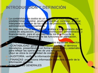 Este documento define conceptos básicos de contabilidad de costos como costos, gastos, sistemas de costeo y componentes del costo total. Explica que la contabilidad de costos es un sistema para predeterminar, registrar, acumular, distribuir, controlar, analizar e interpretar los costos de producción, distribución, administración y financiamiento para la toma de decisiones. También diferencia entre empresas comerciales y de transformación, y describe las funciones básicas de estas últimas como compra, producción y distribución.