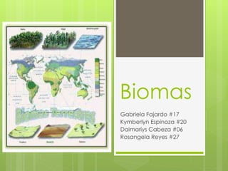Este documento describe los biomas, que son áreas definidas climática y geográficamente que comparten condiciones ecológicas similares como comunidades de plantas, animales y organismos del suelo. Los biomas están definidos por factores como la estructura, tipo y espaciado de las plantas y el clima. El documento luego describe las características de la flora y fauna del bioma tropical, incluyendo mamíferos, aves y peces comunes en la zona, y explica la importancia de clasificar los diferentes tipos de biomas de la T