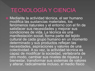La técnica es una manifestación social que permite al ser humano modificar su entorno para satisfacer sus necesidades y mejorar su calidad de vida. A lo largo del tiempo, el hombre ha creado y mejorado nuevos aparatos tecnológicos que le han ayudado a progresar y desarrollarse, aumentando su bienestar. La técnica distingue al hombre de los animales y le ha permitido crear procedimientos para obtener resultados beneficiosos, pensando no solo en sí mismo sino en el futuro de la humanidad.