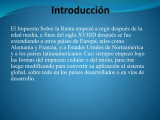El Impuesto sobre la Renta grava los ingresos netos de personas naturales, jurídicas y otras entidades económicas, constituyendo el tributo más justo y ecuánime. Es la forma más directa, creciente y general de medir la capacidad de pago y por ello es el mejor impuesto directo, utilizado ampliamente en sistemas tributarios modernos. Además de ser el impuesto con mayor suficiencia financiera, genera mayores ingresos fiscales que otros tributos o ingresos del Estado, incluso en Venezuela donde parte de los pagos fiscales de la