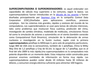 Este documento describe diferentes tipos de computadoras, incluyendo supercomputadoras, macrocomputadoras, minicomputadoras, microcomputadoras y estaciones de trabajo. Las supercomputadoras son las más rápidas y poderosas, utilizadas para tareas de cálculo intensivo. Las macrocomputadoras manejan grandes cantidades de datos, mientras que las minicomputadoras se ubican entre macro y micro en capacidad. Las microcomputadoras son sistemas pequeños y versátiles como PCs, notebooks y PDAs. Las estaciones de trabajo son más