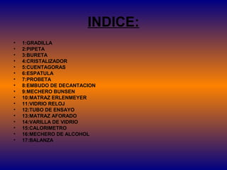 El documento proporciona definiciones breves de 17 herramientas y materiales de laboratorio comúnmente utilizados en química, incluyendo gradillas, pipetas, buretas, cristalizadores, cuentagotas, espátulas, probetas, embudos de decantación, mecheros Bunsen, matraces Erlenmeyer, vidrios de reloj, tubos de ensayo, matraces aforados, varillas de vidrio, calorímetros, mecheros de alcohol y balanzas.