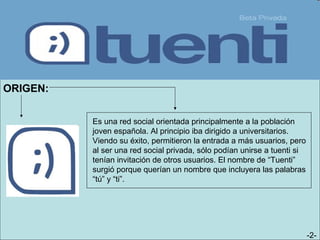 Tuenti es una red social creada en España en 2006 por el estadounidense Zaryn Dentzel. Inicialmente dirigida a estudiantes universitarios españoles, Tuenti ha crecido hasta tener 8 millones de usuarios en 2010. Ofrece funciones como perfiles de usuario, mensajería, juegos, chat y compartir fotos y videos.