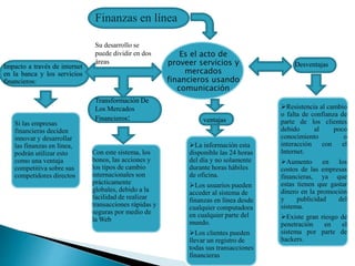 Este documento describe el impacto de Internet en la banca y los servicios financieros. Explica que las finanzas en línea permiten proveer estos servicios usando comunicaciones electrónicas. Identifica algunas desventajas como la resistencia al cambio de los clientes y mayores costos para las empresas. También menciona riesgos de seguridad. Sin embargo, destaca que las finanzas en línea pueden usarse como ventaja competitiva y permiten acceso global a mercados financieros las 24 horas del día.
