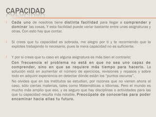 El documento ofrece consejos para mejorar el rendimiento académico. Recomienda buscar un lugar fijo y silencioso para estudiar, establecer un horario de estudio constante, y tomar descansos regulares. También enfatiza la importancia de comer de manera equilibrada, hacer ejercicio, y cultivar las amistades para mantener el bienestar emocional y físico.