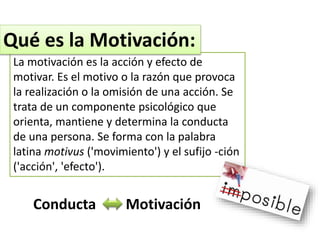 Este documento trata sobre la motivación. Define la motivación como la acción y efecto que provoca la realización u omisión de una conducta, y que orienta y determina el comportamiento de una persona. Explica que la motivación tiene que ver con las razones subyacentes a una conducta, ya sea por qué se exhibe cierta conducta o cómo se lleva a cabo. También discute las fuentes de la motivación, que pueden ser internas o ambientales, y cómo la motivación está relacionada con la supervivencia y el crecimiento de un individuo.