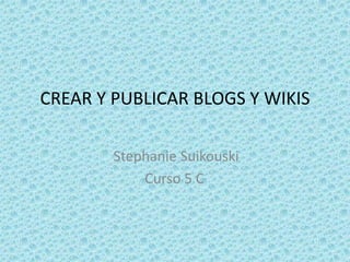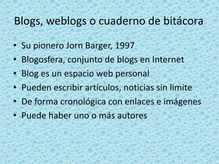 Este documento describe las características y usos de blogs y wikis. Los blogs son espacios web personales donde los autores pueden publicar artículos de forma cronológica e incluir enlaces e imágenes. Los lectores pueden dejar comentarios. Las wikis permiten que varias personas autoricen y editen contenido de forma colaborativa. El documento también explica diversas aplicaciones educativas de blogs y wikis, como su uso por profesores para compartir materiales y por estudiantes para publicar trabajos y recibir comentarios.