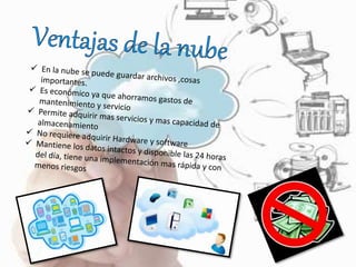 La nube permite ofrecer servicios de almacenamiento masivo de archivos en internet de forma segura, como fotos, videos y documentos, que pueden accederse desde cualquier lugar. Algunas aplicaciones populares para almacenar archivos en la nube son Dropbox, OneDrive, Google Drive, Bitcasa, A Drive y Mega, que ofrecen diferentes cantidades de almacenamiento gratis o pago y funciones de sincronización y compartición de archivos.