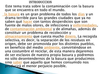 Este documento trata sobre la basura y la contaminación. Explica que la basura es un problema mundial que causa daños al medio ambiente y la salud. Se clasifica la basura en orgánica, inorgánica y desechos sanitarios. También habla de formas de prevenir la contaminación como reducir, reutilizar y reciclar. El objetivo es crear conciencia sobre los problemas que causa la contaminación y formas de cuidar el medio ambiente.