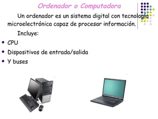 Un ordenador es un sistema digital capaz de procesar información que incluye una unidad central de procesamiento (CPU), dispositivos de entrada y salida, y buses. La CPU ejecuta instrucciones de programas y controla el ordenador. La memoria almacena información temporalmente, incluyendo el disco duro, la memoria RAM y la caché. Los dispositivos de entrada/salida permiten la interacción con elementos externos. La arquitectura Von Neumann describe las 4 secciones principales de un ordenador: la unidad lógica y aritmética, la un