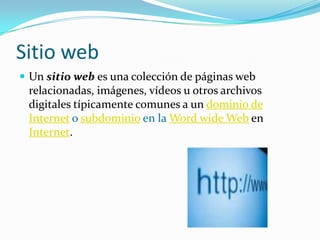 El documento describe diferentes herramientas de internet como sitios web, navegadores, buscadores, correo electrónico, chat, foros, videoconferencia, tutoriales, hipervínculos, software libre, software comercial, software de sistema y software de aplicación. También advierte sobre los peligros de dar información personal en redes sociales.