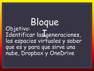 La primera generación de la web consistía en páginas estáticas sin interacción del usuario. La segunda generación permitió contenido dinámico generado por tecnologías como PHP. La tercera generación fomenta el contenido colaborativo. Los espacios virtuales son entornos en línea que representan escenarios reales o ficticios creados con VRML. Una nube almacena y procesa datos de usuario en servidores. Dropbox permite almacenar y acceder a archivos desde cualquier dispositivo mediante una cuenta. OneDrive carga archivos se