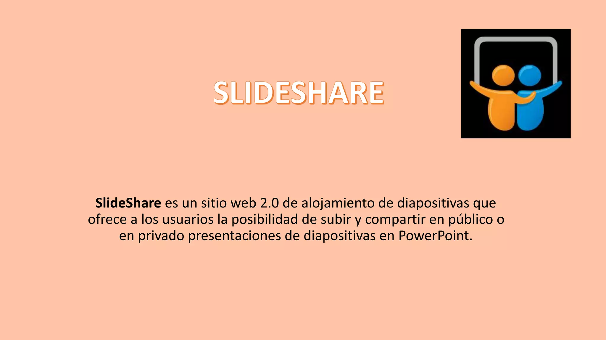 SlideShare es un sitio web que permite a los usuarios subir y compartir presentaciones de diapositivas de PowerPoint de manera pública o privada. Los usuarios pueden evaluar, comentar y compartir el contenido subido. SlideShare ofrece alojamiento gratuito y permite acceder a través de registro o cuenta de Facebook.