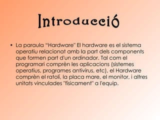 El documento describe la evolución del hardware a través de cuatro generaciones, desde los primeros ordenadores basados en válvulas hasta los circuitos integrados. La primera generación incluye el ENIAC y el UNIVAC I. La segunda generación utilizó transistores y memoria de núcleo magnético. La tercera generación se basó en los circuitos integrados y el IBM S/360. Finalmente, la cuarta generación introdujo el ratón y la idea del ordenador personal.