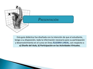 El documento presenta la bienvenida y las instrucciones para participar en el curso en línea de álgebra lineal. Explica que el aula virtual está dividida en tres columnas con información relevante y que la columna central contiene el material del curso. También describe las normas para participar en foros y chats virtuales, como responder preguntas planteadas y citar fuentes de manera adecuada en los foros, y conectarse a tiempo y pedir la palabra en los chats.