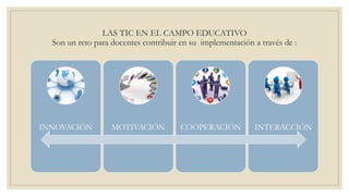 Las TIC representan un reto para los docentes, quienes pueden contribuir a su implementación a través de la innovación, motivación, cooperación e interacción. Algunas estrategias para motivar a los estudiantes a estudiar carreras TI incluyen actividades de reflexión sobre el proyecto de vida, videos sobre las profesiones más requeridas y presentaciones sobre los títulos que otorgan los estudios de TI. Los docentes pueden incorporar las TIC en el aula teniendo en cuenta el área, grado y herramientas tecnológicas disponibles