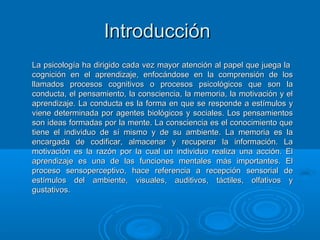 El documento describe varios procesos psicológicos como la conducta, el pensamiento, la consciencia, la memoria, la motivación y el aprendizaje. Explica que la conducta es la forma en que se responde a estímulos y está determinada por factores biológicos y sociales. El pensamiento son ideas formadas por la mente, mientras que la consciencia es el conocimiento que tiene el individuo de sí mismo y su ambiente. La memoria codifica, almacena y recupera información. La motivación es la razón por la cual se realizan
