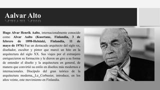 Este documento resume la influencia del arquitecto finlandés Alvar Aalto en el diseño de bibliotecas. Aalto introdujo el movimiento moderno en la arquitectura de Finlandia en la década de 1920. Diseñó estanterías graduables y mobiliario a escala para niños en bibliotecas. Su legado humanizó y ecologizó los espacios bibliotecarios. Algunas de sus obras arquitectónicas más representativas incluyen bibliotecas, hospitales, viviendas y edificios públicos.