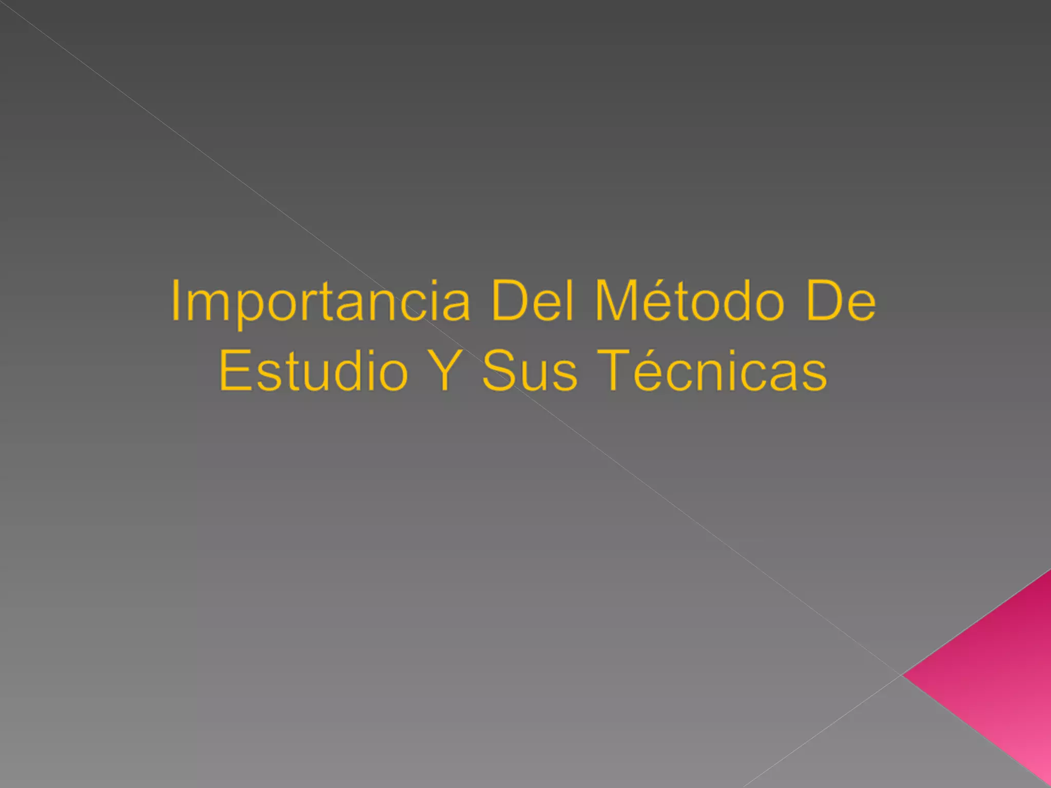 El documento describe los métodos y condiciones óptimas para estudiar de manera efectiva. Explica que estudiar en grupo puede ser más provechoso que estudiar solo, y que factores como el orden, las condiciones físicas, el lugar y el tiempo dedicado impactan el rendimiento. También detalla siete pasos clave para el método de estudio como prelectura, notas al margen, lectura comprensiva, subrayado, esquema, resumen y memorización.