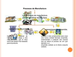 El documento describe los diferentes tipos de procesos de manufactura, incluyendo operaciones de proceso, operaciones de ensamble, procesos de formado, procesos de mejora de propiedades y operaciones de procesado de superficies. Las operaciones de proceso transforman materiales mediante la aplicación de energía, mientras que las operaciones de ensamble unen componentes. Los procesos de formado alteran la geometría de los materiales aplicando fuerza o calor. Los procesos de mejora de propiedades mejoran las propiedades físicas sin cambiar la forma