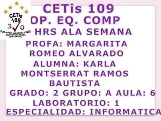 Este documento presenta información sobre un curso de operaciones de equipos de cómputo impartido a una alumna. Incluye detalles sobre la alumna, el programa de estudio que cubre competencias genéricas y disciplinares, y ejemplos de prácticas y ejercicios sobre hardware, software, seguridad e higiene al trabajar con equipos de cómputo.