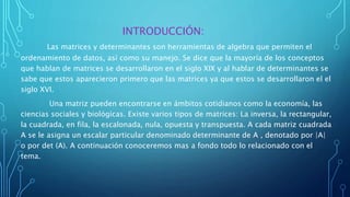 Este documento presenta una introducción a las matrices y determinantes. Define una matriz como una tabla rectangular de números dispuestos en filas y columnas, y un determinante como un escalar asignado a cada matriz cuadrada. Explica los tipos de matrices, cómo calcular determinantes, sumar y multiplicar matrices, y aplicar determinantes para resolver sistemas de ecuaciones lineales. Concluye que tanto las matrices como los determinantes son herramientas matemáticas importantes.