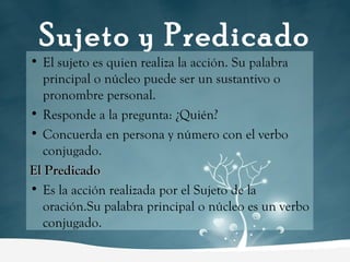 El documento habla sobre los conceptos básicos de la gramática española como el sujeto, predicado, sustantivos, pronombres, adjetivos y la acentuación. Explica que el sujeto es quien realiza la acción y el predicado es la acción, y da ejemplos de oraciones. También define los diferentes tipos de sustantivos como individuales y colectivos, y las clases de pronombres. Por último, explica brevemente sobre los adjetivos, palabras primitivas y derivadas, y las palabras agudas, llanas y esdrújulas.