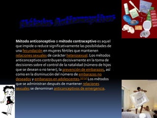 Los métodos anticonceptivos ayudan a prevenir embarazos no deseados al reducir las posibilidades de fecundación durante las relaciones sexuales. La planificación familiar utiliza métodos anticonceptivos para controlar la reproducción ya sea para no tener hijos o decidir cuántos tener y el momento de tenerlos considerando factores sociales, económicos y personales. Los métodos anticonceptivos de emergencia se usan después de las relaciones sexuales.