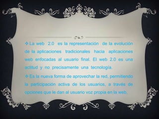 La Web 2.0 representa la evolución de las aplicaciones web tradicionales hacia aplicaciones enfocadas en el usuario final, permitiendo la participación activa de los usuarios al administrar y compartir contenido. Esto aumenta el interés de los usuarios en la red al sentirse parte de ella. A diferencia de la Web 1.0, donde los usuarios solo recibían información estática, la Web 2.0 tiene páginas dinámicas con formatos como JavaScript y PHP que permiten más funcionalidad e interacción entre usuarios.