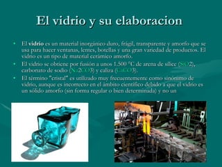 El vidrio es un material inorgánico duro y frágil obtenido por la fusión de arena de sílice, carbonato de sodio y caliza a alrededor de 1,500°C. Se usa para hacer ventanas, botellas y otros productos. Los antiguos egipcios descubrieron el vidrio de forma accidental. El vidrio se utiliza comúnmente para envases de bebidas, alimentos, cosméticos y medicinas. Los vitrales son ventanas de vidrios de colores ensamblados con plomo que alcanzaron su apogeo en