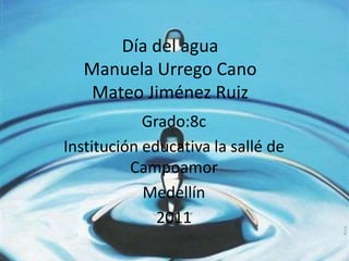 El documento describe el agua, incluyendo su composición química, estados y usos. Explica que el agua está compuesta de oxígeno e hidrógeno, y es esencial para la vida. Describe sus estados sólido, líquido y gaseoso, y sus usos en la casa como para beber, limpiar y lavar. Concluye enfatizando la importancia de cuidar y usar el agua de manera responsable cerrando las llaves cuando no se esté usando.