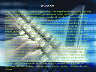 Internet es una red de redes que interconecta computadoras y redes de computadoras a través de diferentes medios, permitiendo compartir recursos de manera global gracias al protocolo TCP/IP. Originalmente se usaba Internet para búsquedas de información pero ahora hay un gran abanico de posibilidades que a veces puede ser abrumador debido al gran crecimiento en el número de usuarios. Internet tiene características como ser universal, fácil de usar, variada, económica, útil, libre, anónima y de auto regulación, aunque también plantea desafí