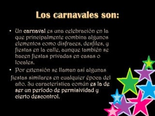 Los carnavales son celebraciones que incluyen disfraces, desfiles y fiestas. El documento describe varios carnavales importantes como el de Río de Janeiro, conocido por sus espectaculares carrozas y desfiles musicales, el Carnaval de Venecia reconocido por su tradición e historia, y el Carnaval de Veracruz en México, considerado el más alegre del mundo por su ambiente festivo de nueve días.