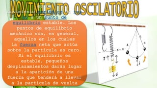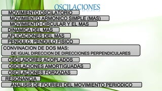 Este documento trata sobre oscilaciones y movimiento oscilatorio. Explica conceptos como movimiento armónico simple, periodo, frecuencia y amplitud. Describe las propiedades de los sistemas oscilantes como el movimiento repetitivo, la fuerza restauradora y la posición de equilibrio. Finalmente, clasifica los tipos de oscilaciones como movimiento armónico simple, oscilaciones amortiguadas y forzadas.