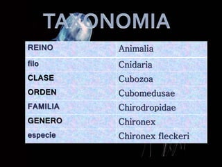 1) La Chironex fleckeri es una especie de medusa venenosa que vive en aguas tropicales de Australia y Filipinas.