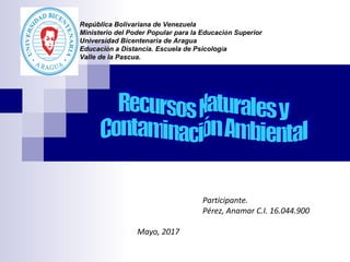 El documento clasifica los recursos naturales en renovables y no renovables. Los recursos renovables incluyen plantas, animales y agua, que pueden reponerse si se usan de forma sostenible. Los recursos no renovables como minerales y petróleo no pueden regenerarse. También explica la importancia de conservar los recursos y los tipos de contaminación como la del agua, aire y suelo, causados por actividades humanas como la industria.