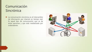 El documento describe dos tipos de comunicación mediada por computadora: comunicación síncrona y asincrónica. La comunicación síncrona es en tiempo real mientras que la comunicación asincrónica no requiere que los participantes estén conectados al mismo tiempo. Se proporcionan ejemplos de ventajas y desventajas de cada tipo de comunicación así como actividades de Moodle que apoyan cada una.
