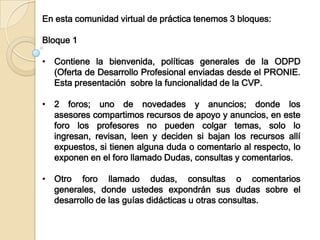 Este documento describe la estructura de una comunidad virtual de práctica con 3 bloques. El Bloque 1 contiene la bienvenida y políticas generales, así como dos foros para anuncios y dudas. El Bloque 2 es un curso sobre tratamiento de información en proyectos con un foro de discusión. El Bloque 3 brinda apoyo sobre programación con una tabla de documentos y dos foros para compartir recursos y experiencias. El equipo de asesores participará 2 veces por semana y los profesores deben hacerlo al menos 2 veces semanalmente para apoy
